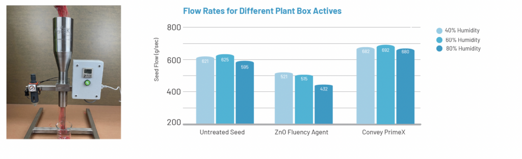 Convey PrimeX goes beyond a basic seed-flow aid, to become a novel plant establishment technology. It is new class of plant establishment technology for planter-box delivery, integrating three functional components in a single, easy-to-apply dry formulation: