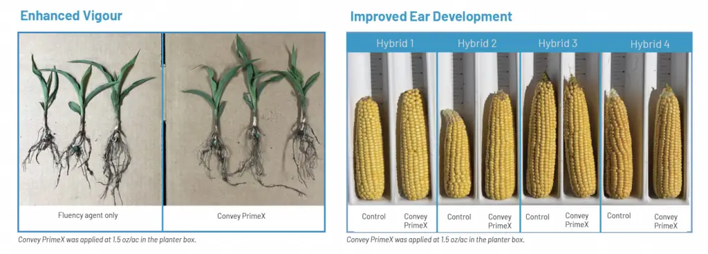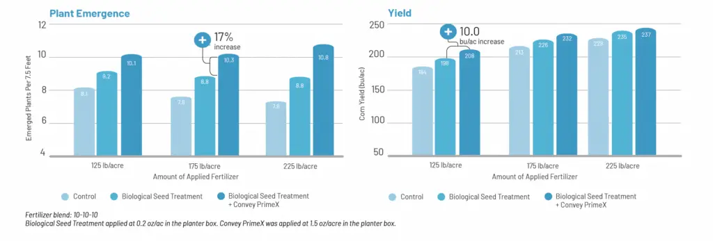 Replicated corn trials showed the addition of Convey PrimeX to the biological seed treatment increased seed germination, emergence, vigor, number of kernels per ear and weight per ear. Plant emergence increased from 10-23% with the addition of Convey PrimeX compared to the biological seed treatement regardless of the amount of soil applied fertlizer. The end result was an overall grain yield up to 10 bu/ac. In addition, Convey PrimeX out performed all other treatments at all rates of soil applied fertilizer.