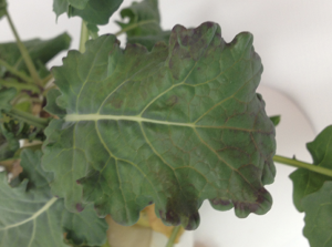 • Older and middle leaves display chlorotic spots with necrotic areas.